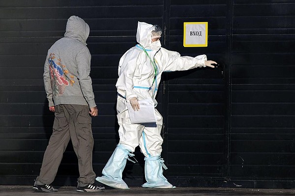 A medical worker wearing protective gear escorts a woman, suspected of having coronavirus, at a hospital in Kommunarka, outside Moscow, Russia, Saturday, Dec. 5, 2020. Thousands of doctors, teachers and others in high-risk groups have signed up for a COVID-19 vaccination in Moscow starting Saturday, a precursor to a Russia-wide immunization effort. (AP Photo/Pavel Golovkin)