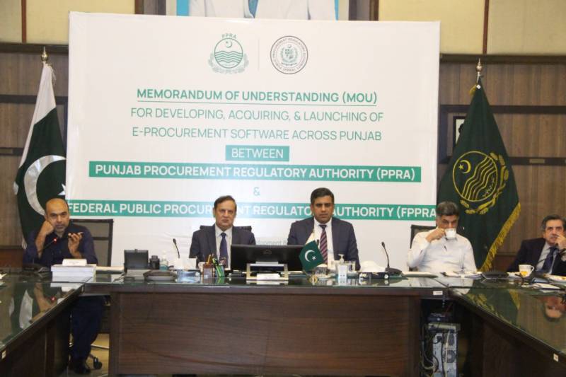 A Memorandum of Understating (MoU) signing ceremony regarding signing for developing, acquiring and launching of E-procurement Software Across Punjab between Punjab Procurement Regulatory Authority and Federal Public Procurement Regulatory Authority has been conducted in the auditorium of Planning & Development Board. Chairman P&D Board Mr Abdullah Khan Sumbal Chairman gave the opening remarks through video link.