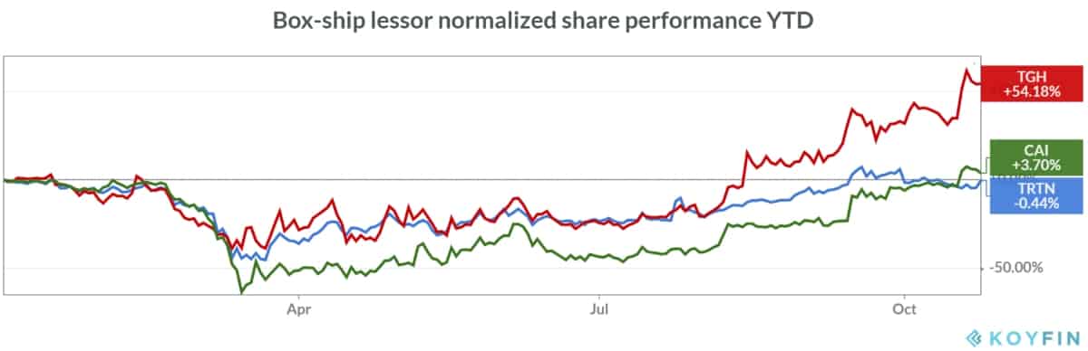 Stocks of box lessors like Triton, Textainer (NYSE: TGH) and CAI International (NYSE: CAI) are popular for container bets. Not only do they benefit from higher lease rates and longer contract durations as consumer demand for box shipments rises, but counterparty risk declines as carriers’ bottom lines strengthen. Stocks of Triton and CAI have recovered from COVID drops; Textainer has more than recovered.