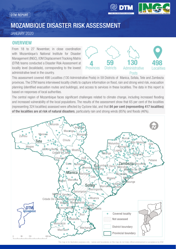 From 18 to 27 November, in close coordination with Mozambique’s National Institute for Disaster Management (INGC), IOM Displacement Tracking Matrix (DTM) teams conducted a Disaster Risk Assessment at locality level (localidade), corresponding to the lowest administrative level in the country. This assessment covered 498 Localities (130 Administrative Posts) in 59 Districts of Manica, Sofala, Tete and Zambezia provinces.