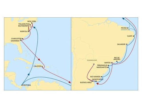 Buenos Aires – Montevideo Rio Grande – Navegantes – Paranagua – Santos – Rio De Janeiro – Salvador – Suape – Cristobal – Philadelphia – New York – Norfolk – Baltimore – Charleston – Savannah – Caucedo – Santos.