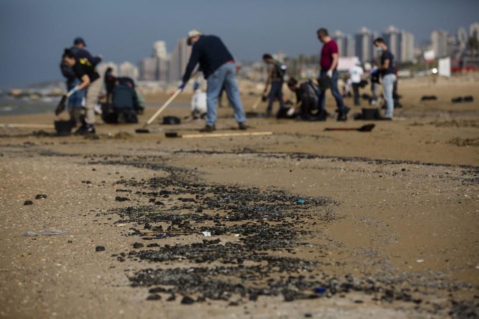HAIFA, ISRAEL – FEBRUARY 25: Israelis clean tar from the sand after a suspected oil spill off … [+]