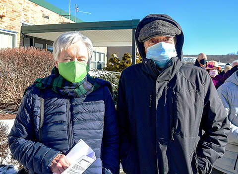 Maureen and Vincent Marcantonio, of North Smithfield, were two of many in line to be vaccinated for COVID-19 last Saturday at Smithfield High School after the state released a limited amount of vaccines for residents age 75 and older. The couple said they will be happy to see their children and grandchildren and go back to church when it’s safe to do so. (Breeze photo by Charles Lawrence)