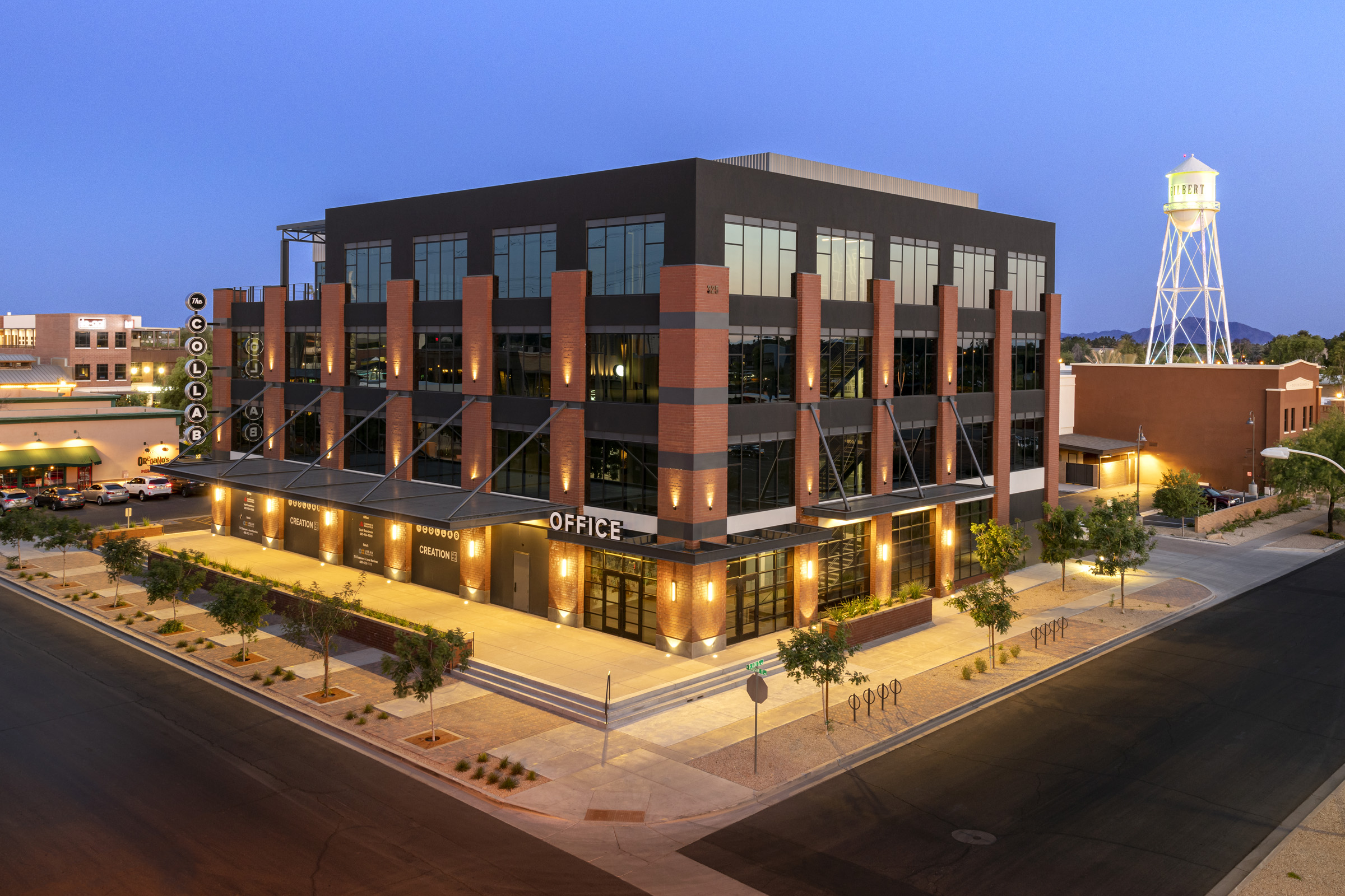 Project Description: The Collab building design, colors and materials have a cohesive palette that maintains consistency throughout both the site and building elevations while complimenting the surrounding Gilbert Downtown Heritage District.
