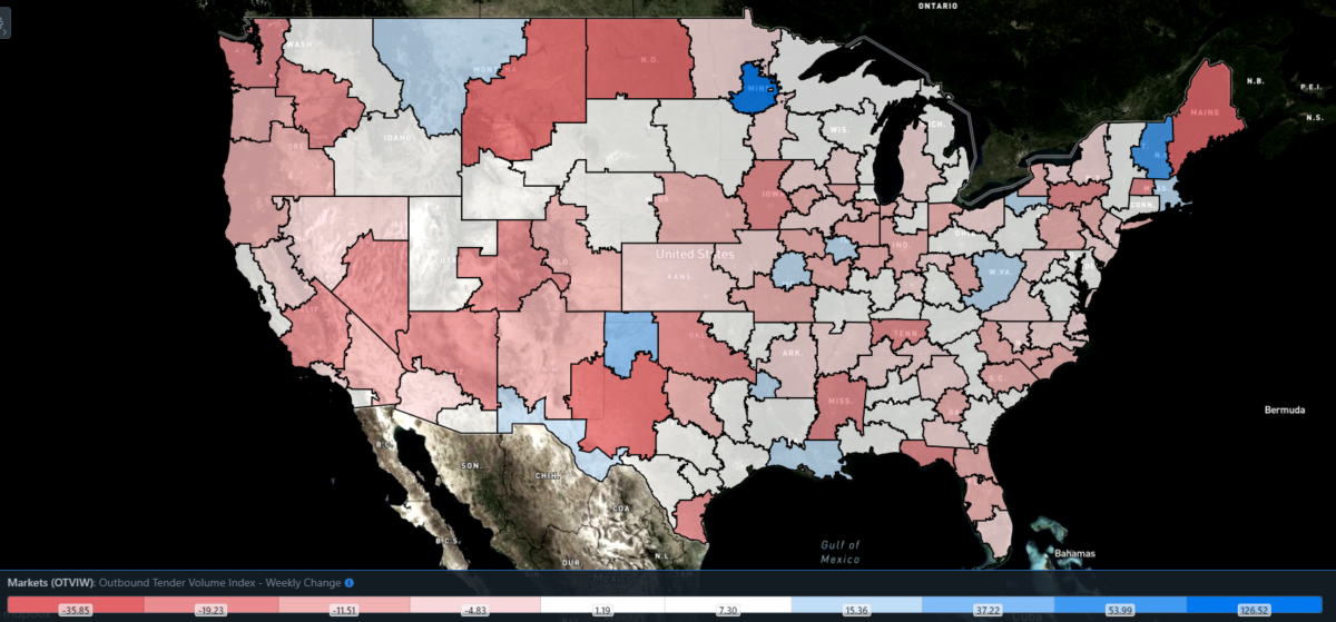 The map above shows the Weighted Rejection Index (WRI), the product of the Outbound Tender Reject Index — Weekly Change and Outbound Tender Market Share, as a way to prioritize rejection rate changes. As freight demand falls off in the largest markets, capacity is substantially looser across the board.