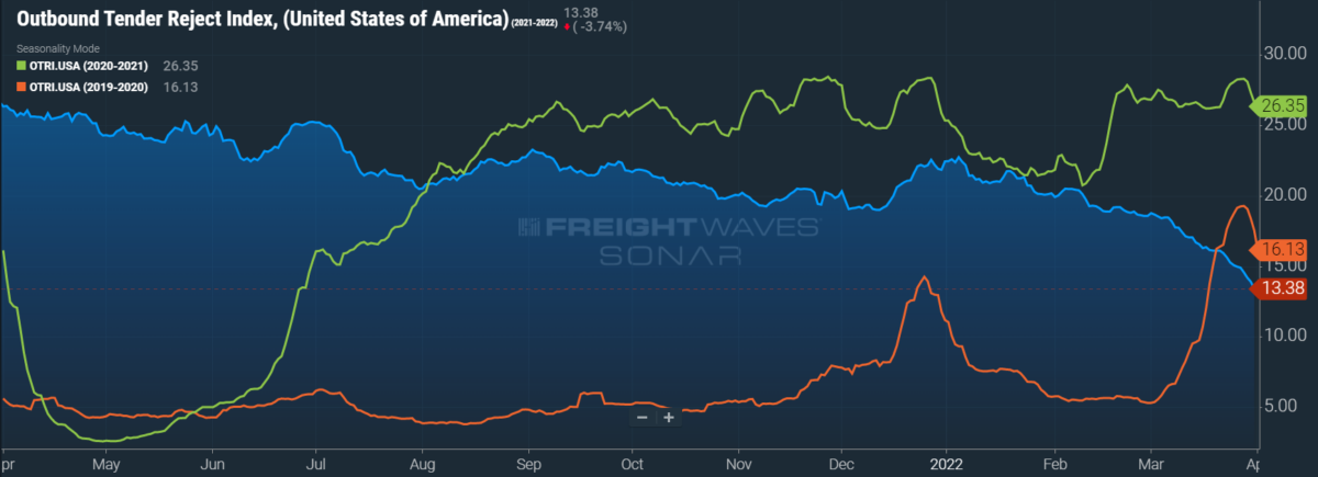 Turning to accepted tender volumes, which is OTVI adjusted by the Outbound Tender Reject Index (OTRI), we see only minuscule growth by 0.72% y/y and 0.38% week-over-week (w/w). Given that OTVI can be inflated by a rising OTRI and that tender rejections in 2021 were far above those in the present year, March’s weakened OTVI had looked more favorable on a y/y basis when comparing accepted tender volumes. No more is that the case: Real freight demand is on a steady decline.