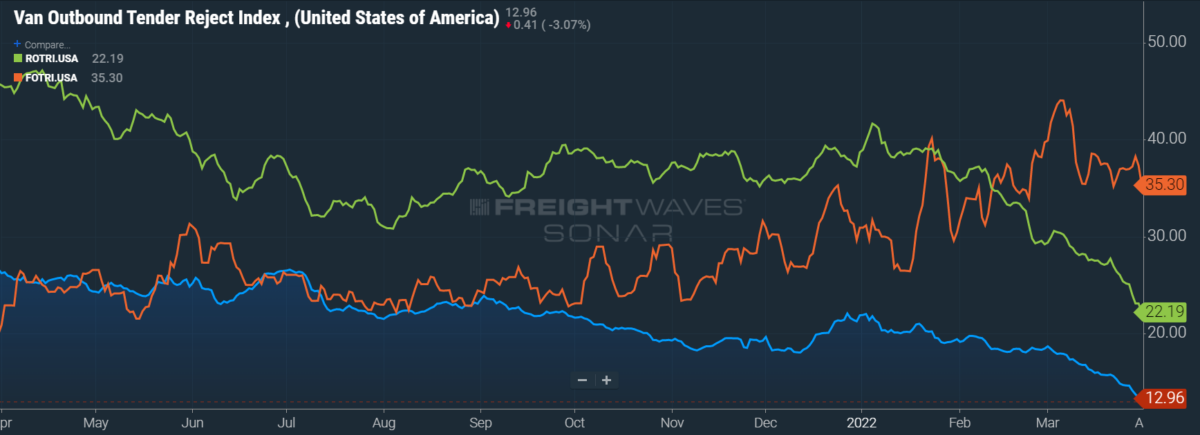 Van rejection rates are driving the decline in the overall OTRI, as the Van Outbound Tender Reject Index (VOTRI) is now at 12.96%, 189 bps lower on a w/w basis. Capacity conditions in the reefer market continue to ease, as the Reefer Outbound Tender Reject Index (ROTRI) fell 386 bps to 22.19%.