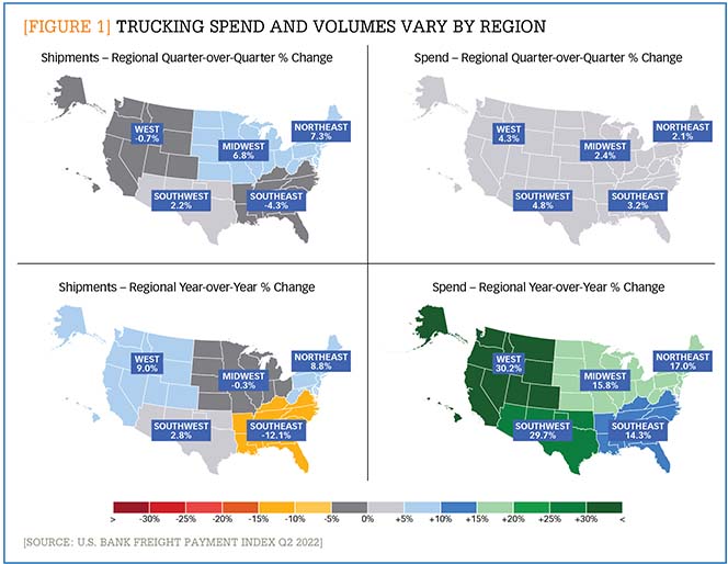 But as spending on travel and services began to increase in 2022 and the economy contracted in Q1, trucking capacity opened up and the freight market shifted back to contract carriers. The slight decrease in demand was offset, however, by the dramatic rise in fuel prices, as well as some strength in manufacturing and housing in various parts of the country. These factors helped push the spend index higher in Q2, in spite of the modest slowdown in the economy during the quarter. From a volume standpoint, the U.S. Bank National Shipments Index increased 2.3% in Q2.