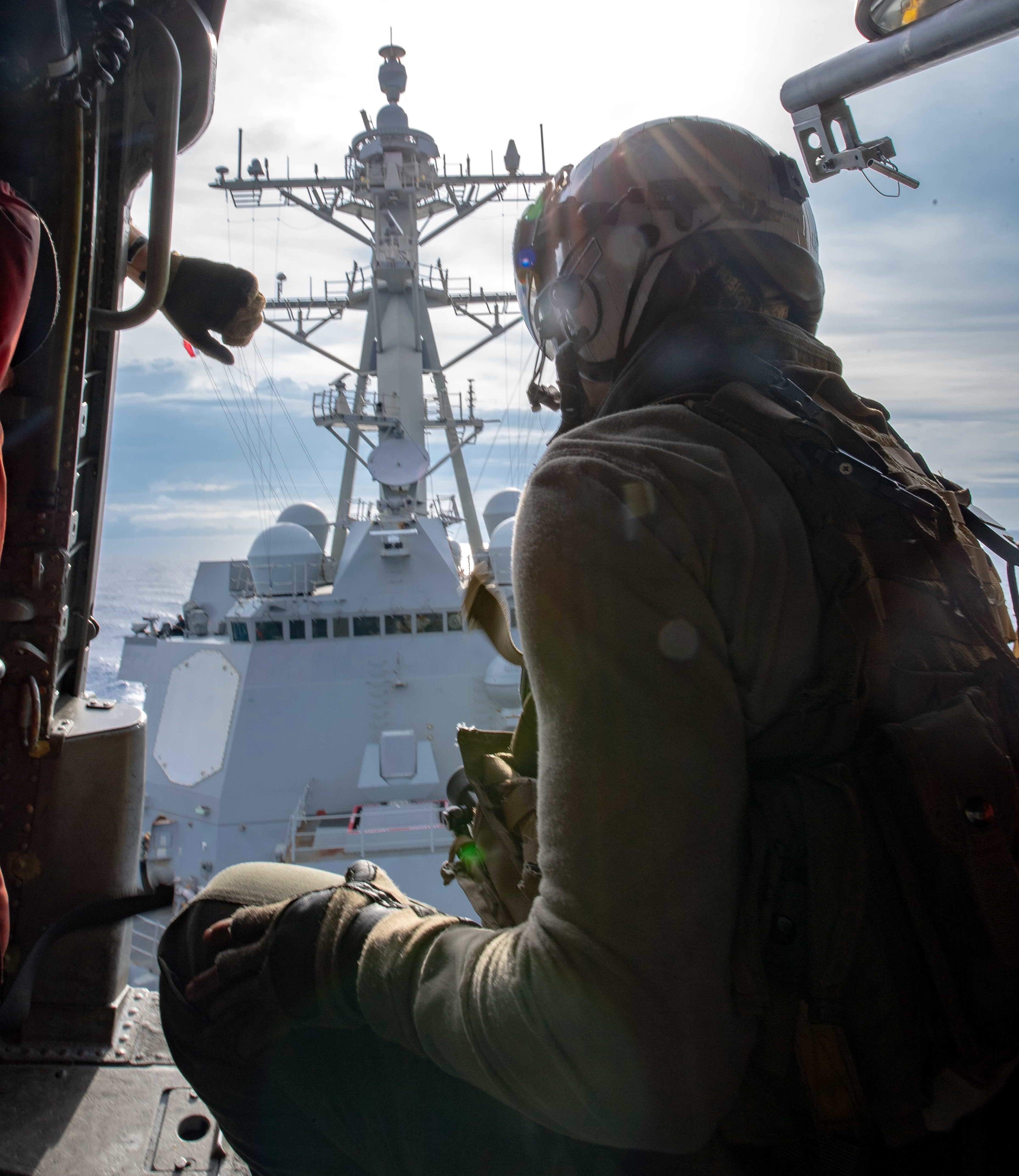 Naval Aircrewman (Helicopter) 2nd Class Ancent Devera, a native of Honolulu, Hawaii conducts a dry rope exercise with Arleigh Burke-class guided-missile destroyer USS Stockdale (DDG-106) while flying in an MH-60S Knight Hawk, assigned to ‘The Black Knights’ of Helicopter Sea Combat Squadron (HSC) 4, Dec. 18, 2021. US Navy Photo