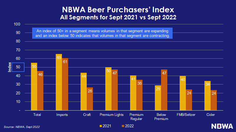 • The imports index stands as the only beer segment in expansion territory with a reading of 61 in September 2022, slightly lower relative to the September 2021 reading of 65.