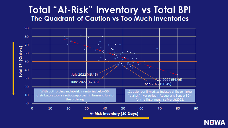 Last week, the National Beer Wholesalers Association (NBWA) released the Beer Purchasers’ Index (BPI) for September 2022. The September 2022 BPI results show the total beer index is at 45.5 and the “at-risk” inventory at 50.0. The September data marks a shift to a lower “at-risk” inventory measure compared to September 2021 and August 2022, indicating distributors are carefully managing inventories heading into the fourth quarter. Continued inflationary pressures and a slowing economy bring the industry to a fourth month of pause after five months of positive ordering trends in 2022.