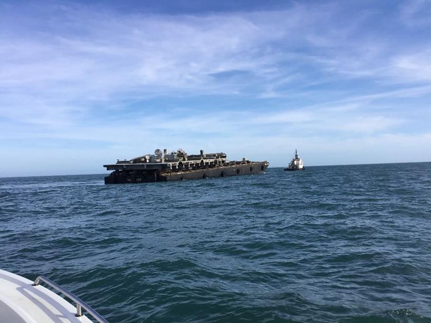 Demolition debris from the old Bonner Bridge sits on a barge recently waiting to be transported to a dump site offshore. (NCDOT photo)