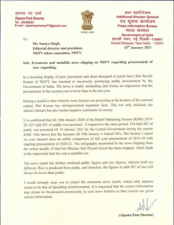 The letter sent to the NDTV Ethics committee by the Press Information Bureau’s Additional Director General has said that Ravish Kumar has done an unfair comparison of full year procurement of 2019-20 with ongoing procurement for 2020-21. It also states that Piyush Goyal’s tweet was cropped in the TV program, giving the impression that it was a malafide act.