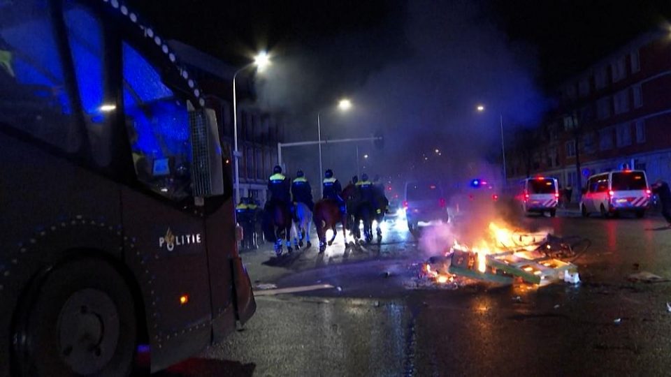 Police in the Hague detain rioters and clear the streets after protesters set bicycles and wooden pallets on fire, as a demonstration against the Dutch government’s coronavirus restrictions turned violent for a second night in the Netherlands.