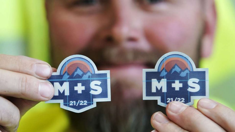Jake Brown, Utah Department of Transportation roadway operations supervisor, holds a pair of stickers at the UDOT’s maintenance shed in Cottonwood Heights on Tuesday. A sticker program for the Cottonwood canyons, which aims to increase vehicle safety and preparedness by pre-inspecting vehicle tires for winter driving conditions, is back for a third year. (Jeffrey D. Allred, Deseret News)