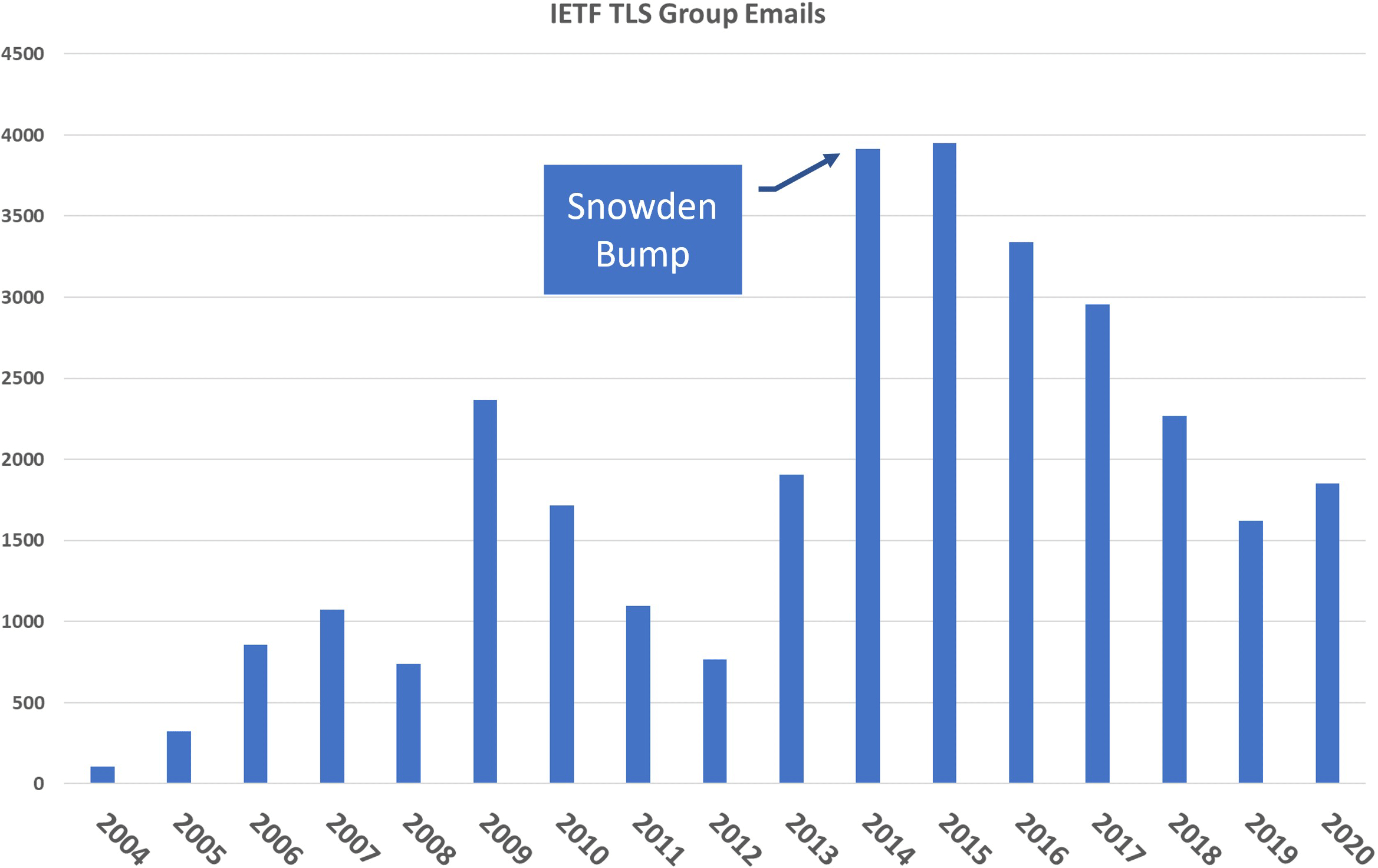 The principal home for this crypto-anarchy activity has been an IETF working group known as TLS (for Transport Layer Security) — which is ironic given the origins of a trusted TLS in NSA’s public-private SDNS initiative publicly announced in 1986 and placed in standards of the ITU and ISO several years later. Much of the IETF TLS work was accomplished via 30,000 emails between 2004 and today. The metrics show a prominent “Snowden Bump” in 2014. Twenty people accounted for 50% of those emails — making them rock-stars in the crypto anarchy world and sought-after commodities by those exploiting the resulting marketplace. The crypto-anarchy champion of the group generated more than 2100 emails and holds 13 patents.