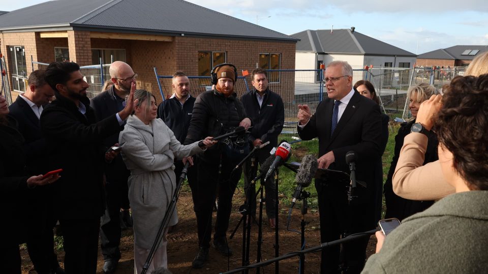 Prime Minister Scott Morrison speaks at a press conference during a visit to a housing site in the suburb of Armstrong Creek, on May 18, 2022 in Geelong, Australia. The Australian federal election will be held on Saturday 21 May.