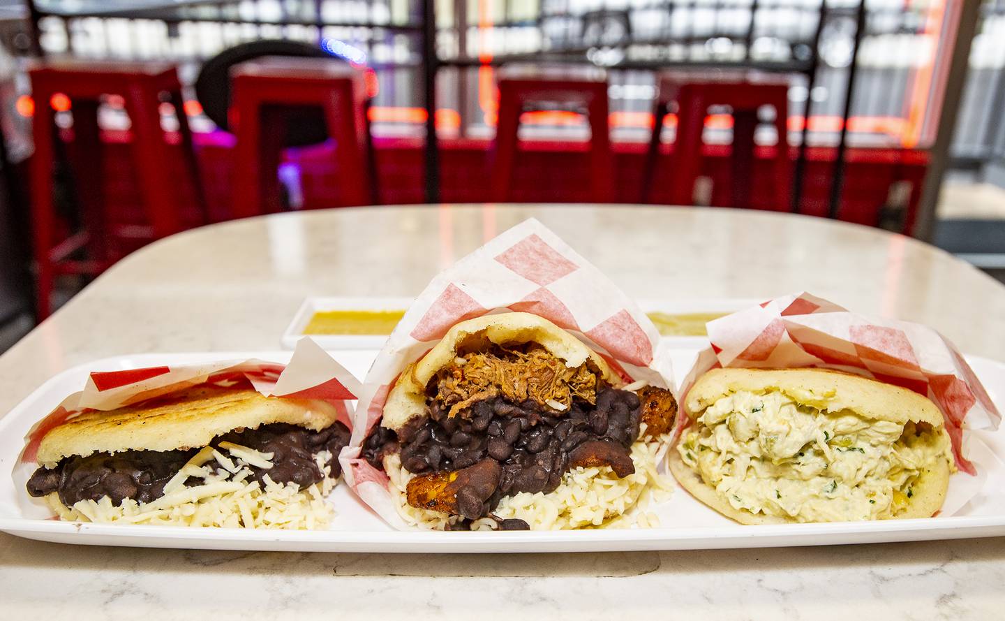 La Bicicleta’s menu focuses on grilled arepas (starting at $8.25) — traditional Venezuelan cornmeal patties — that are cut open and stuffed with various ingredients.