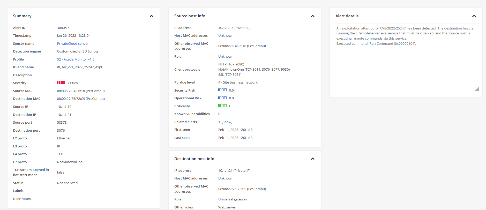 eyeInspect uses a new Access:7 Monitor script to identify vulnerable devices and detect exploitation attempts against them. The figure below shows the alert raised by eyeInspect when it detects an exploitation attempt against CVE-2022-25247.