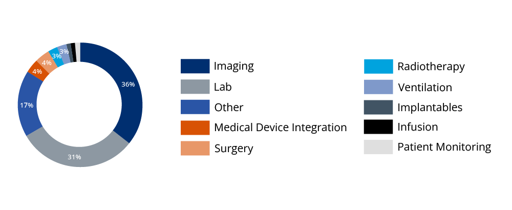 The figure below illustrates the distribution of medical device types running Axeda. The agent was found to be more popular in imaging (36%) and lab (31%) machines than in any other type.