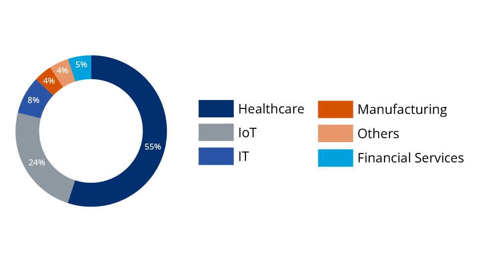The figure below illustrates the distribution of vendors in our device lake that use Axeda. More than one-half of those (55%) belong to the healthcare industry, followed by almost one-quarter (24%) developing IoT solutions.
