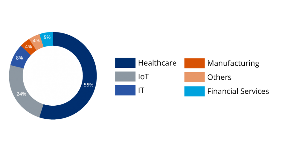 The figure below illustrates the distribution of vendors in our device lake that use Axeda. More than one-half of those (55%) belong to the healthcare industry, followed by almost one-quarter (24%) developing IoT solutions.