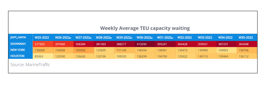 According to MarineTraffic, the Port of New York and New Jersey ranked second in the weekly average of waiting TEU capacity on the East Coast with 156,000 twenty-foot equivalent units floating at sea. Savannah, Georgia, had the most as of Monday with 366,000 TEUs; Houston had 143,000 TEUs stacked on anchored vessels.
