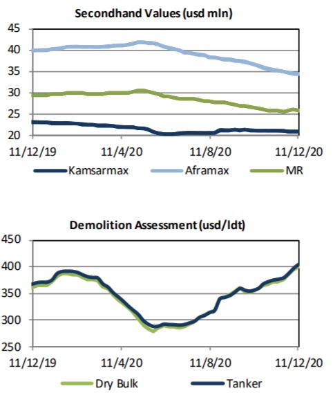 Meanwhile, activity has been rather brisk in the S&P market as well. Banchero Costa said this week that “it was a rich week in terms of number of concluded deals for both dry bulk and tankersegments. In the dry bulk segment, interest was mainly focused on Supramax and Ultramax units with about a dozen of transactions. Among those we can report several units from the young ‘Red Daisy’ 61,000 dwt built in 2016 at Iwagi which was sold for $18.7 mln to undisclosed to the older and smaller ‘Diva Eva’ 52,000 dwt built in 2006 at Tsuneishi Cebu sold for $6.8 mln. In the Kamsarmax segment it is worth to mention ‘Key Evolution’ 83,000 dwt built in 2010 at Hudong sold to undisclosed buyers for a price in the mid/high $14s mln (SS/DD passed and BWTS fitted) and ‘SBI Zumba’ 82,000 dwt built in 2016 at Hudong sold for $20 mln. 3 x older VLCCs were respectively sold at $21, $25 and $25.5 mln during the week: ‘Maran Regulus’ built in 2000 at Samsung, ‘Eagle’ built in 2002 at Samsung and ‘Sea Lion’ built in 2003 at Hyundai. Generally, VLCC units with fairly good SS/DD position are still being of interest, whilst those with SS/DD due are now facing demolition dilemma; considering a surge in demo prices this may end up with decision to go forscrap. 2 x LR2 resales with high spec, tier III and scrubber fitted were sold for $55 mln each to undisclosed buyers. Aframax ‘Pamisos’ built in 2011 by Sumitomo achieved $21.8 mln: this segment is seeing prices in a slightly softening trend. As regards smaller product tankers, it emerged an enbloc sale of 4 x LR1 units from Norden, Denmark to Middle Easter buyers. Ships are 75,000 dwt built in 2004 at HHI for a total price of $41 mln. Norden offloaded also an MR2 ‘Nord Pearl’ 50,000 dwt built in 2009 at SPP to SpanishMarflet at $16.2 mln”.