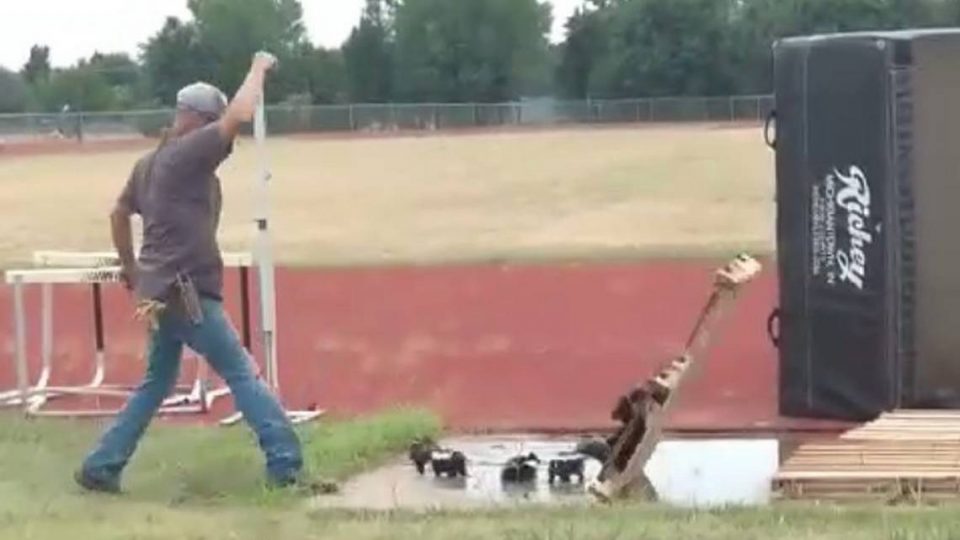 A Newton schools staff worker attempts to remove a wooden pallet that a group of skunks made a home out of over the weekend on the high school’s track field.
