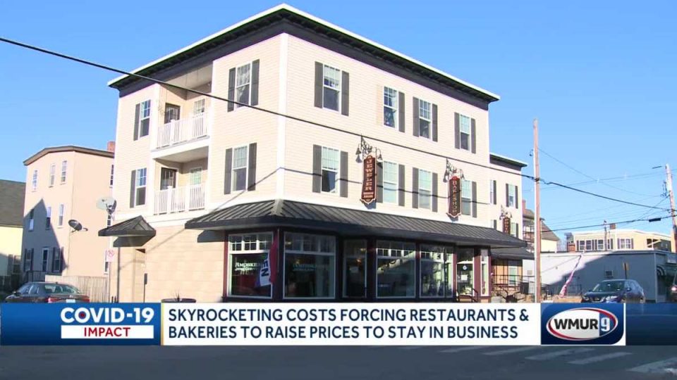 Supply chain issues brought on by the pandemic are extending to food in New Hampshire grocery stores, restaurants and bakeries.Some who run eating establishments said prices are often double or more when they can find what they’re looking for.”It definitely costs more now to do business,” said Denise Nickerson, owner of The Bakeshop on Kelley Street. “We’re paying a lot more for products.”Nickerson said the oil she uses to cook her doughnuts rose from $17 to $55 per gallon. She said her supplier is having a tough time getting other items.”I mentioned cream cheese, and all he did was start laughing,” Nickerson said.It’s the same with the famous lamb shanks at Café Nostimo in Portsmouth.”We’ve tried many, many avenues, and it’s just unavailable right now, and no answers as to when they’re coming,” said Dean Zottos, owner of Café Nostimo.The whole tomatoes used in the restaurant’s sauces are also tough to find.”Some of them are packed in cans from California, and it’s family-owned, and they said there’s no tin to pack the tomatoes in,” Zottos said.It all adds up.”When you’re putting chicken on a plate which is two and a half times the price, and it’s a fry product, for instance, and you’re frying it in a fryolator with the oil two and a half times the price, and then we put it into a container to go, which is two times the price — the bottom line is really just shrinking,” Zottos said.”They used to call it ‘creeping’ in the business, where prices creep up, but now, now they’re jumping,” said Jay McSharry, who owns 10 Seacoast-area restaurants.McSharry had advice for the chefs at his restaurants.”We need to raise prices, or we’ll be out of business,” he said.Zottos said that when restaurants’ costs double, theoretically, prices should too, but that wouldn’t be cost-effective because it would drive customers away.