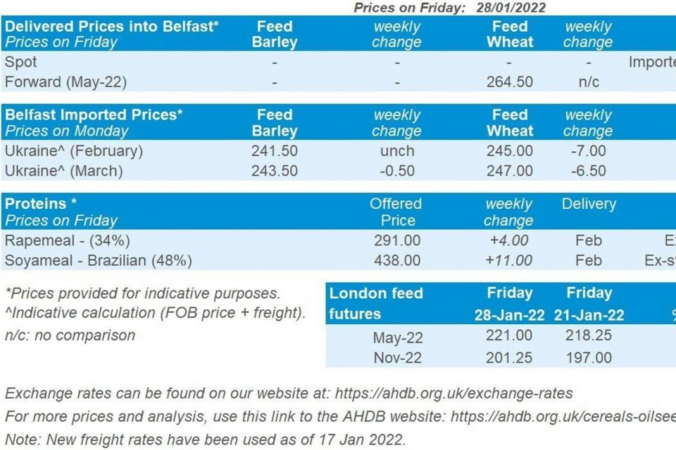 Rapeseed focus – All the support for soyabeans and palm oil filtered into rapeseed prices. Paris rapeseed futures (Aug-22) closed Friday at €615.75/t, gaining €7.25/t across the week. The domestic delivered market followed. Rapeseed delivered (into Erith, hvst-22) was quoted at £510.50/t last Friday, gaining £8.00/t from 21 January.
