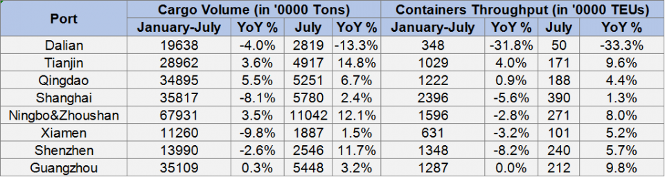 The chart below shows the cargo throughput and container throughput data of the eight major ports in China.