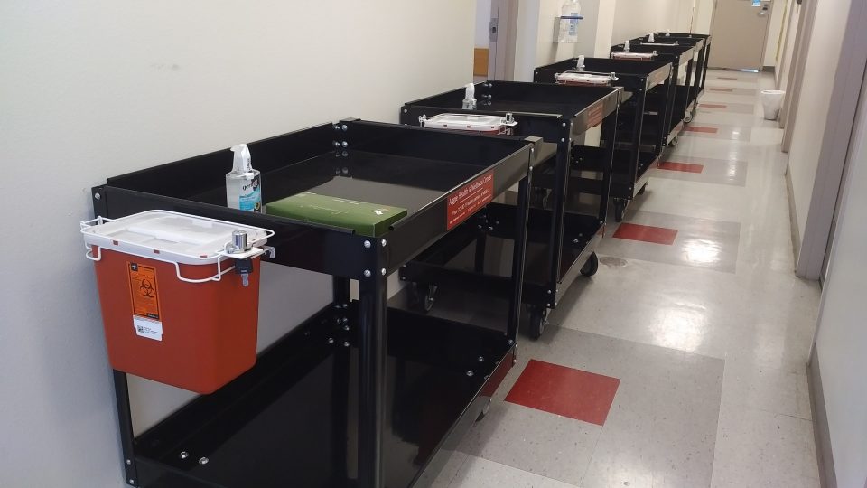 Point of distribution carts are set up at New Mexico State Universitys Aggie Health and Wellness Center. NMSU purchased and equipped the carts in preparation to provide vaccine distribution for the community on its Las Cruces campus. (NMSU photo)