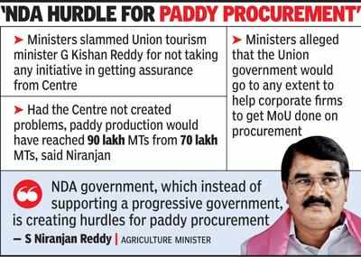 Agriculture minister S Niranjan Reddy on Thursday said: “We have neither come here (Delhi) without any work nor the government is writing love letters. The NDA government, which instead of supporting a progressive government, is creating hurdles for paddy procurement.”