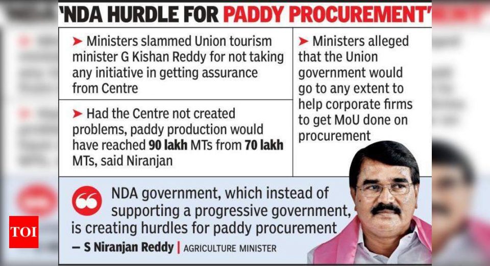 Niranjan Reddy said had the Centre not created problems, paddy production would have reached 90 lakh metric tonnes from 70 lakh MTs. Targeting the Centre, he wondered: “Is it wrong if we implement pro-farmer schemes such as Rythu Bandhu and Rythu Bima and provide irrigation water and free power to agriculture sector.”