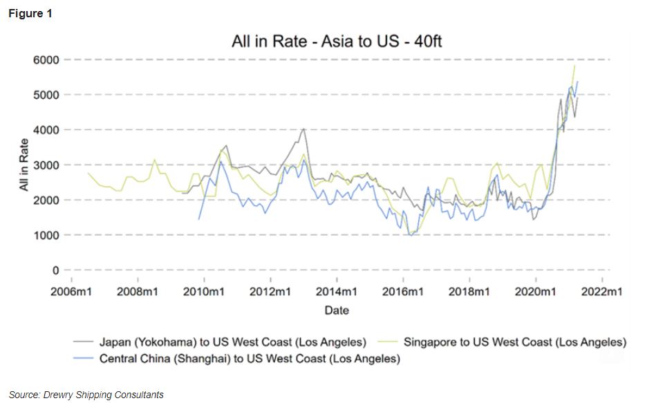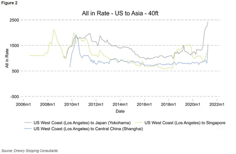 Figure 1 shows that rates from Asia to the U.S. are volatile but have over time moved predominantly within the USD 2,000 to USD 3,000 per FEU band. The unprecedented surge in rates from Q2 2020 onwards is the clear result of the supply-demand imbalances as well as supply chain bottlenecks caused by Covid-19.