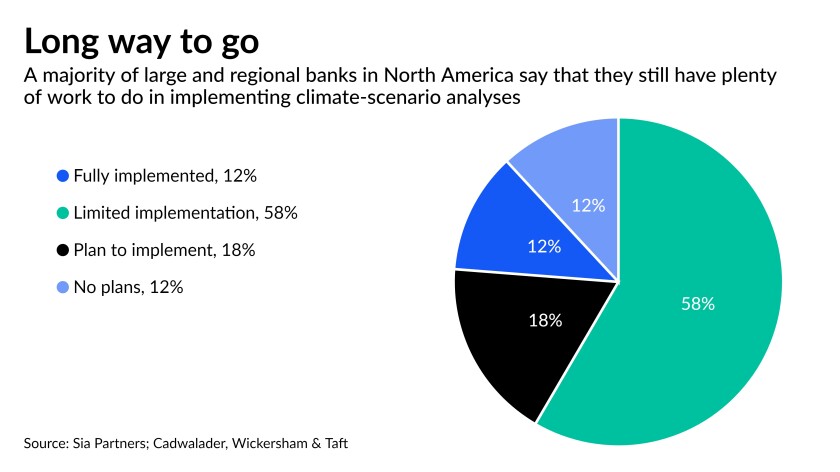 The banking industry is a long way from fully implementing new climate risk tools, with most large and regional institutions still in the early stages of conducting the analyses that regulators are poised to recommend.