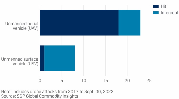 According to research in the Energy Security Sentinel produced by S&P Global Commodity Insights, 75% of the 23 recorded drone attacks over the last five years on Middle East oil and gas facilities in the Gulf using aerial drones hit their target. The data, which analyzes 88 major incidents in total over the period, suggests drones were harder for air defense systems to intercept than conventional missiles.