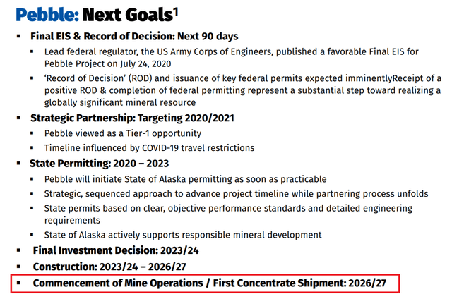 The Pebble project is owned by NAK’s 100% subsidiary; Pebble Limited Partnership (or PLP). The main issue with NAK is that Pebble permitting and subsequent development had been haunted in the past through challenges posted by regulatory and environmental authorities, time and again.