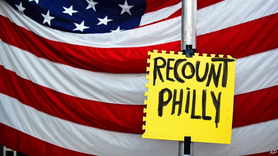 So far, Mr Trump’s lawsuits have fared poorly. But as long as he keeps fighting, most Republicans see more political risk in accepting Mr Biden’s victory—and thus inviting the wrath of Mr Trump—than in humouring him. Another goal of his lawsuits may be to raise just enough doubt about the outcome in key states to pressure Republican-held state legislatures to put forth their own sets of electors, substituting their will for the voters’.