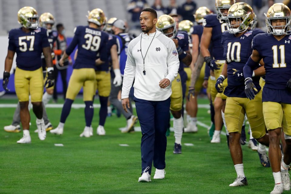 GLENDALE, ARIZONA – JANUARY 01: Head coach Marcus Freeman of the Notre Dame football prepares for the Play Station Fiesta Bowl against the Oklahoma State University Cowboys at State Farm Stadium on January 01, 2022, in Glendale, Arizona. (Photo by Norm Hall/Getty Images)