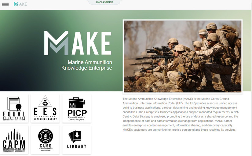 According to developers, MAKE provides a secure unified access point to business applications with robust data mining and knowledge management capabilities. MAKE’s suite of apps supports requirements mandated by existing Marine Corps policies and programs for Marines in ammo and related specialties, regardless of geographic location.