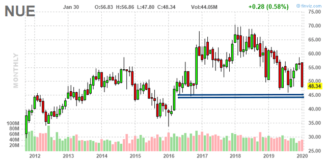 Currently, Nucor is trading at 12.4x next year’s earnings and a dividend yield of 3.4%. The valuation is attractive and the dividend yield is interesting. Nonetheless, both are meaningless in case the economy does not improve. In that case, I expect the stock to break down lower to $30 per share in 2020. However, as I’m bullish on the economy, I expect support at $45 to hold for now. Unfortunately, there’s another factor at play right now. The ongoing worries regarding the coronavirus are very unpredictable and could cause additional short-term volatility. I’m therefore not too focused on technical buying points. I consider Nucor to be a good buy if the economy is indeed able to bottom. Yes, Q4 was bad. But that was expected. What matters now is that the company is getting some fundamental support to back its 2020 outlook.
