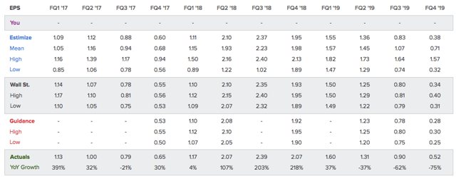 Below is the perfect example of what happens to a cyclical steel company when economic growth is down. In the fourth quarter of 2018, economic growth in the US peaked after a very strong run since the start of 2016. This was a few months after the global economy peaked at the start of 2018. Trade uncertainties and deleveraging in China were major drivers behind this slowing cycle. As you can see, higher economic growth resulted in triple-digit adjusted EPS growth in 2017 and 2018. The slowing trend has accelerated in the fourth quarter, pushing adjusted EPS growth down to $0.52. This is well-above expectations of $0.34 but 75% lower compared to the prior-year quarter when EPS was up 218% to $2.07.