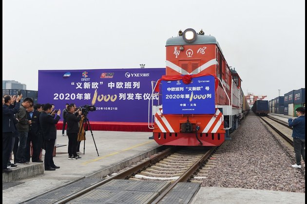 A freight train carrying 100 TEUs of goods departs from Yiwu, east China’s Zhejiang Province, for Minsk in Belarus, Oct. 21, 2020, marking the 1,000th trip by China-Europe cargo trains in the province this year. (Photo by Gong Xianming/Xinhua)