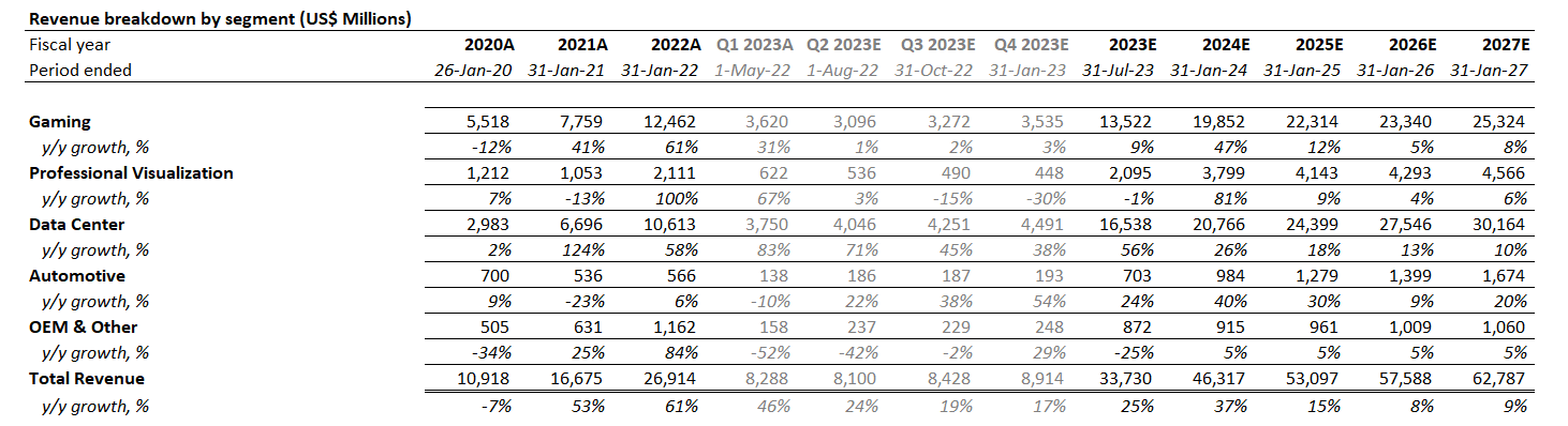 Adjusting our latest Nvidia financial forecast for its actual fiscal first quarter financial results, and growth outlook based on recent technological developments discussed in the foregoing analysis, the company remains on a positive track towards strong double-digit revenue growth in the current year. Total revenues are expected to grow 25% to $33.7 billion by the end of fiscal 2023, with further expansion at a 13% CAGR through fiscal 2027.