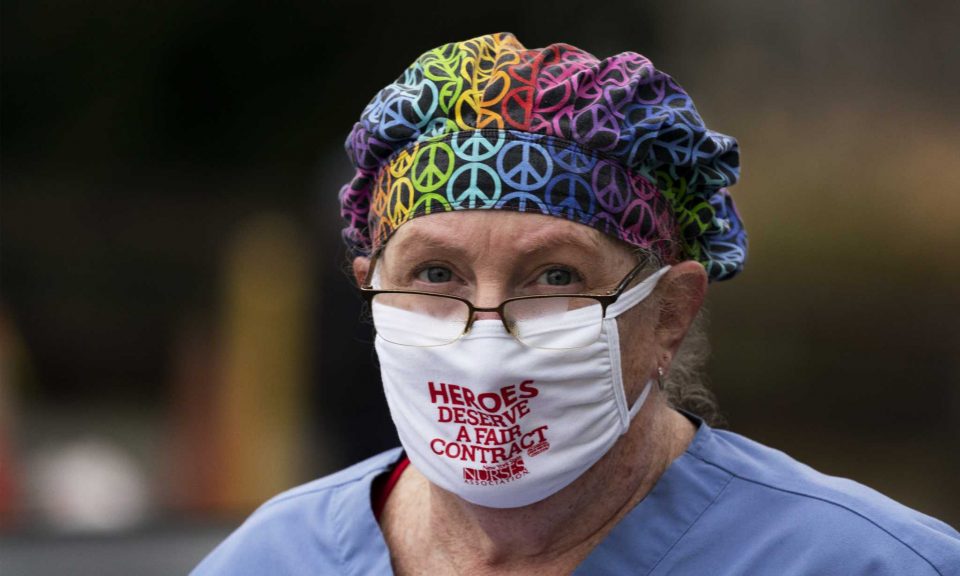 A nurse at Montefiore New Rochelle Hospital goes on strike over safe staffing issues during the coronavirus pandemic, Tuesday, Dec. 1, 2020, in New Rochelle, N.Y.