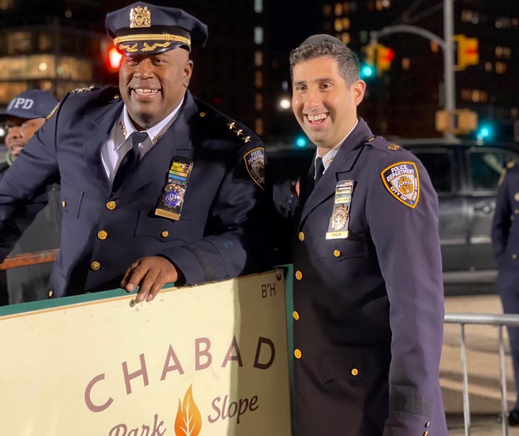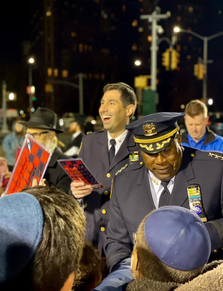 Joining Chief Maddrey for this historic event was Deputy Inspector Richie Taylor who is the Commanding Officer of Community Affairs Outreach for Chief Maddrey and the highest-ranking yarmulke wearing NYPD Officer,; Captain Franz Souffrant, Commanding Officer of the 78 Precinct which is where the Menorah is located; NYPD Clergy Liaison David Heskiel; Detective Mohammad Amen of Community Affairs Outreach and the Muslim Officers Society; Rabbi Moshe Hecht of the Chabad of Windsor Terrace; and Honorary Police Surgeon Dr. Jack Husney.