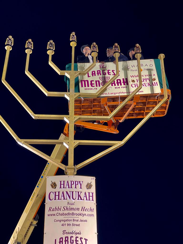 NYPD Chief of Community Affairs Chief Jeffrey Maddrey lit the menorah in Grand Army Plaza in Brooklyn, one of the highest in the world, on Motzoei Shabbos, with over 200 people in attendance. Chief Maddrey also distributed toys to children attendings the lighting. The event was hosted by Rabbi Shimon Hecht of the Chabad of Park Slope.