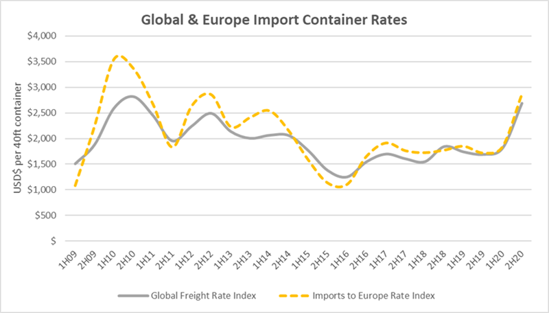 This pattern is quite evident when looking at Drewry’s average global rate index for the past decade. Rates rose in the second half of 2010 during the recovery after the recession years of 2008 and 2009. As vessel capacity and cargo demand came more into balance after that the rates declined steadily until reaching a low in 2016.